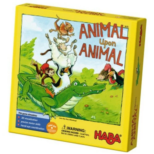 Crocodiles, frilled lizards, sheep, toucans and monkeys, hedgehogs and snakes… you’ll never find such a motley mix of animals in any other game, and it’s celebrating its 10th anniversary: Animal Upon Animal from HABA! The entertaining stacking game was first released in 2005 and has since sold over 600,000 copies! One of HABA’s most popular games, this game is a winner of the Major Fun! Award and recipient of the Mr. Dad Seal of Approval. Players race each other to be the first to place all of their wooden animals upon the animal pile before any of the other players. A roll of the die tells the players how many animals can be placed or whether they can add to the alligator base. This game fosters hand-eye coordination and fine motor skills.
