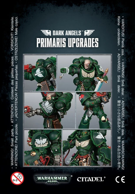 The Dark Angel Primaris Upgrades pack of plastic components can be used to upgrade a variety of Primaris Space Marines with iconography and details specific to the Dark Angels.