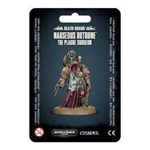 This multi-part plastic kit contains the components necessary to assemble Nauseous Rotbone, a Death Guard Plague Surgeon. He carries a bolt pistol and balesword, but where the real fun lies is in the various corrupted medical instruments he carries – narthecium-like instruments containing horrific plagues are all over his armour, with an ancient, rusted reductor perfect for stealing gene-seeds on his right arm. Much of his armour is concealed by a cowl and cloak, but the armour that is visible is covered in the pits, rust and corrosion expected from such a devotee of the Death Guard. His right shoulder bears a vile plaguebearer’s head, and the device on his back… the less said about that, the better.