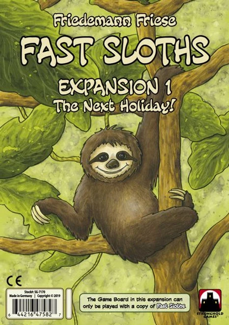 Fast Sloths: Expansion 1 – The Next Holiday! offers a new double-sided giant game board for Fast Sloths, so you can have even more races around the countryside.
