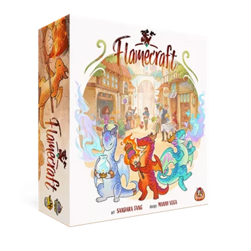 In Flamecraft, 1-5 players take on the role of Flamekeepers, gathering items, placing dragons and casting enchantments to enhance the shops of the town. Dragons are specialized (bread, meat, iron, crystal, plant and potion) and the Flamekeepers know which shops are the best home for each. Visit a shop to gain items and a favor from one of the dragons there. Gathered items can be used to enchant a shop, gaining reputation and the favors of all the dragons in the shop. If you are fortunate enough to attract fancy dragons then you will have opportunities to secure even more reputation.