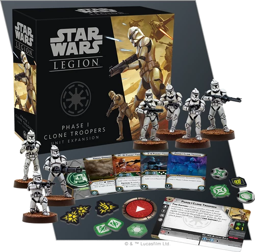 The Phase I Clone Troopers Unit Expansion contains a full unit of seven unique, unpainted Phase I Clone miniatures, identical to the Phase I Clone Troopers included in the Star Wars: Legion Clone Wars Core Set. Five Phase I Clone Troopers wielding DC-15A Blaster Rifles are joined by a Z-6 Phase I Trooper and a DC-15 Phase I Trooper. This expansion also includes a unit card and an assortment of upgrade cards, inviting you to customize your Clone Troopers’ gear to fit your battle plan.
