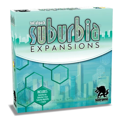 Suburbia: Expansions contains three large expansions for Suburbia that were originally released independently — Suburbia Inc., Suburbia 5★, and Suburbia Nightlife — as well as two smaller expansions: Essen and Cons. These expansions can be used with Suburbia one at a time, in any mixture, or all at once!