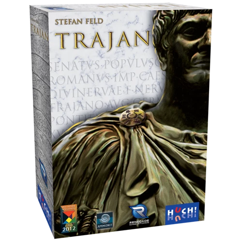 Set in ancient Rome, Trajan is a development game in which players try to increase their influence and power in various areas of Roman life such as political influence, trading, military dominion and other important parts of Roman culture. In Trajan, a player has six possible actions: building, trading, taking tiles from the Forum, using the military, influencing the Senate, and placing Trajan tiles on his tableau. At the start of the game, each player has two differently colored pieces in each of the six sections (bowls) of his tableau. On a turn, the player picks up all the pieces in one bowl and distributes them one-by-one in bowls in a clockwise order. Wherever the final piece is placed, the player takes the action associated with that bowl. Acquire victory points (VPs) in whatever ways are available to you – and since this is a Feld design, you try to avoid being punished, too. At the Forum you try to anticipate the demands of the public. In the Senate you acquire influence which translates into votes on VP-related laws. With the military, you take control of regions in Europe, earning more points for those regions.