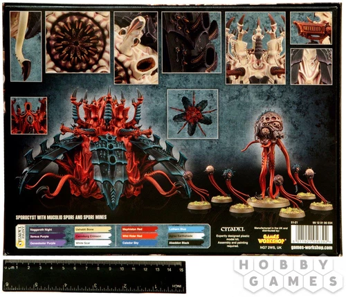 This 124-piece plastic kit makes one Sporocyst and one Mucolid Spore. The Sporocyst is armed with five deathspitters which can be replaced by barbed stranglers or venom cannons. You also get 6 x 25mm round bases, 1x100mm round base and 1x 40mm round base and enough pieces to build 6 Spore mines.